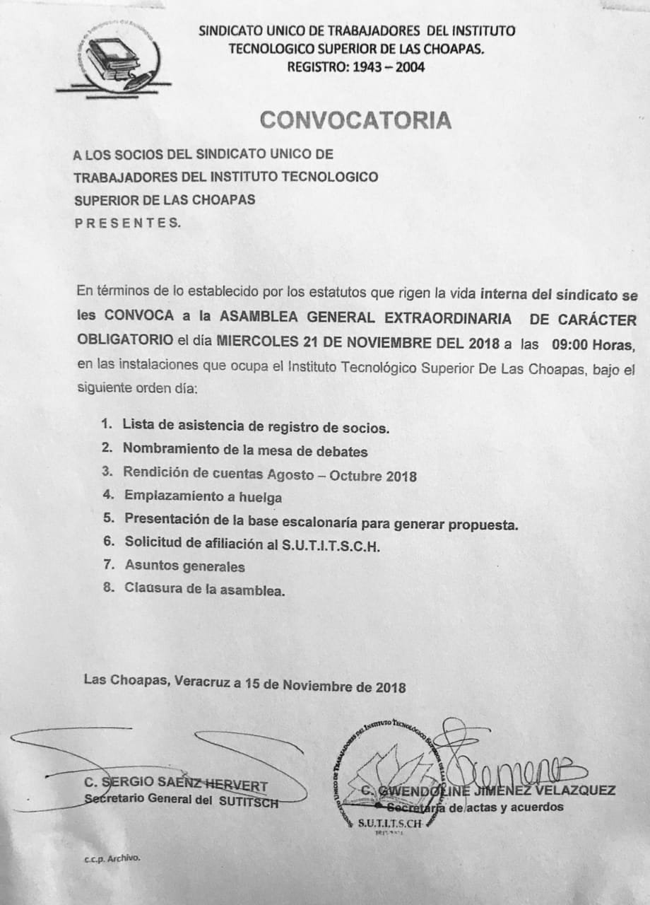 El día de hoy miércoles a las 9 de la mañana el “Secretario” General del Sindicato del Tecnológico de las Choapas Ing. Sergio Sáenz Herbert, convoco con carácter obligatorio a una asamblea general y extraordinaria a todos sus socios de dicho gremio, en las instalaciones del Instituto tecnológico Superior de las Choapas, bajo la siguiente orden del día; 1.- lista de asistencia, 2.- nombramiento de la base de debates, 3.- rendición de cuentas, 4.- EMPLAZAMIENTO A HUELGA, 5.- presentación de la base escalonaría para generar propuesta, 6.- solicitud de afiliación al S.U.T.I.T.S.C.H., 7.- asuntos generales y 8.- clausura de asamblea.