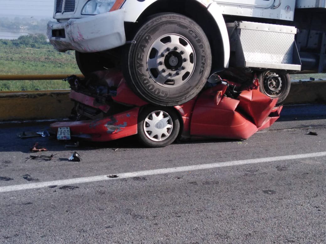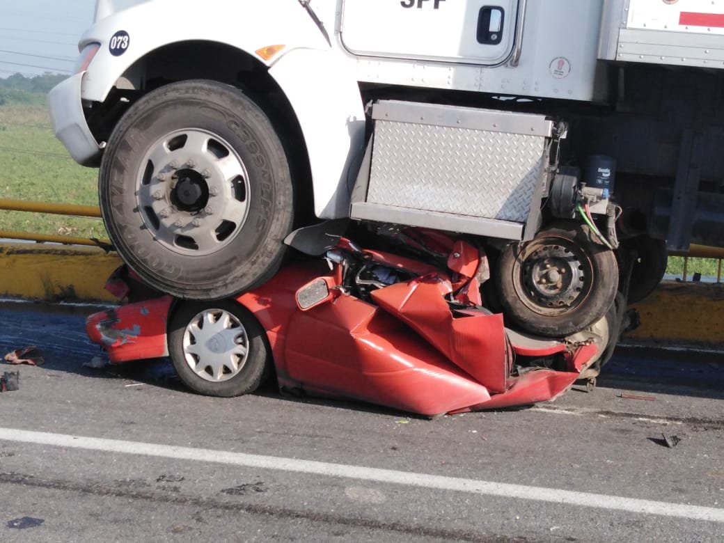 De acuerdo a los datos aportados, el accidente se da por alcance de un tráiler que literalmente se montó sobre el auto compacto, con daños estimado en perdida total y con las consecuencias fatales ya descritas.