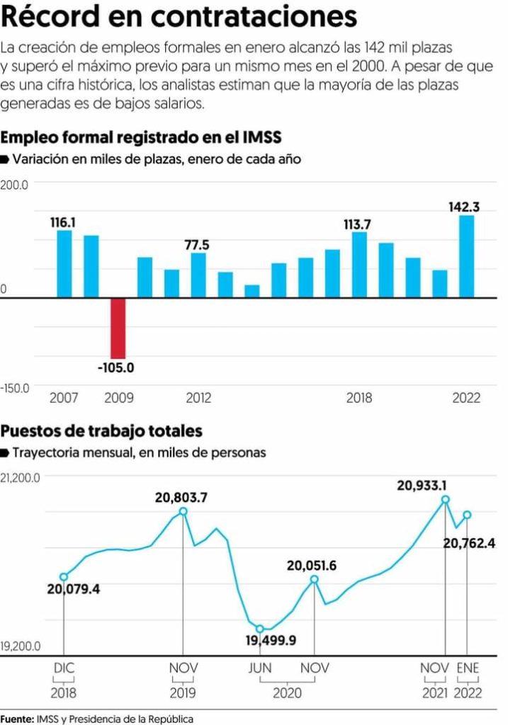 La creación de empleos formales en México, medida por los afiliados al IMSS, registró en enero la cifra más alta de los últimos 24 años, al contabilizar 142 mil 271 plazas.