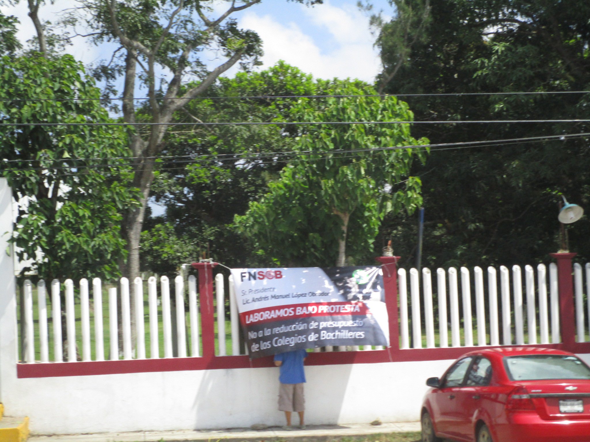 Por ello tan sólo han colocado mantas en las afueras de los planteles educativos, donde dan a conocer la situación que ocurre y que trabajan bajo protesta, a la espera que les giren indicaciones la dirigencia.