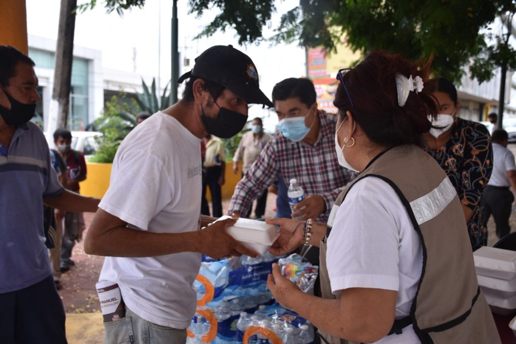 Coatzacoalcos, Ver. – Como cada semana, el Comedor Comunitario que lleva alimentos calientes a las personas en situación vulnerable, llegó a la Plaza Santa Cecilia para apoyar a los que menos tienen.