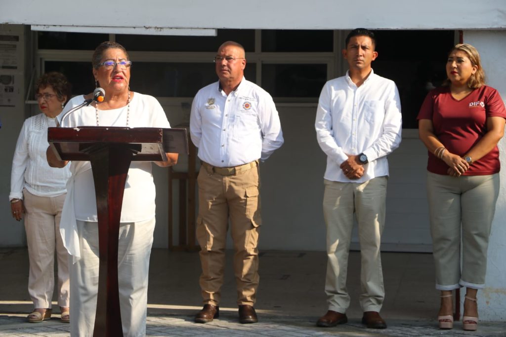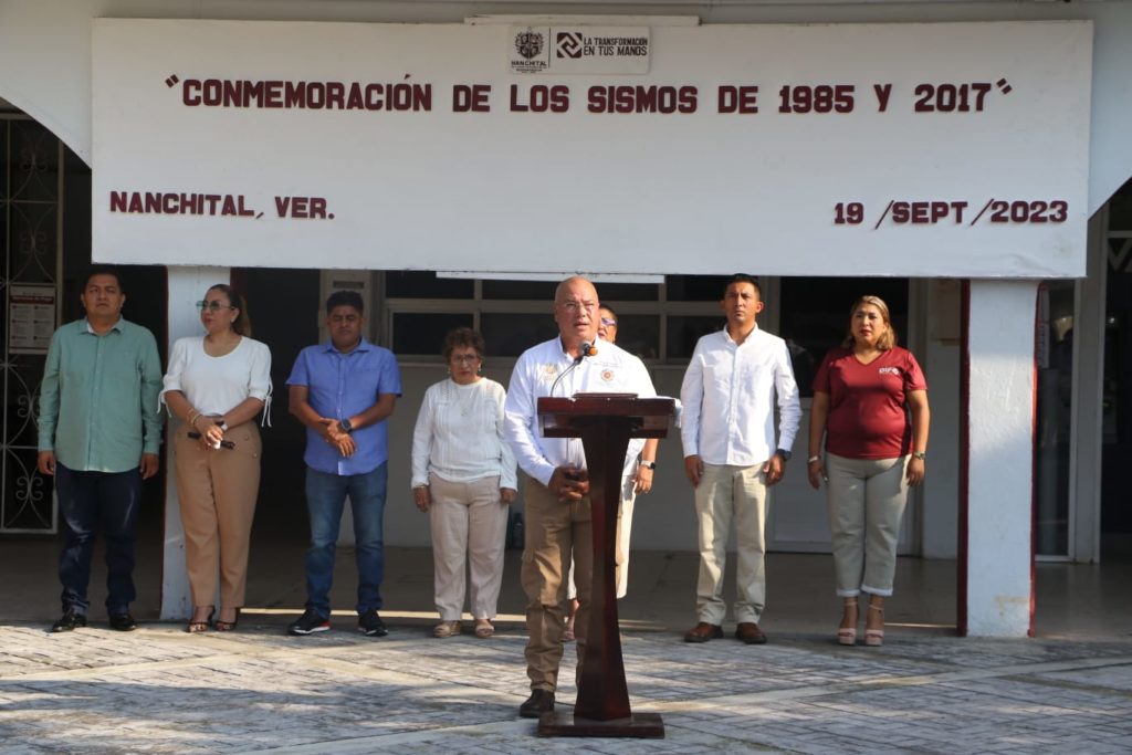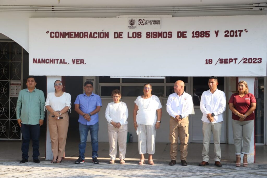 Nanchital, Ver. – La mañana de este martes, autoridades municipales de Nanchital llevaron a cabo una ceremonia cívica para conmemorar el Día Nacional de Protección Civil, así como recordar los sismos de 1985 y 2017, en las inmediaciones del Parque Central Benito Juárez.