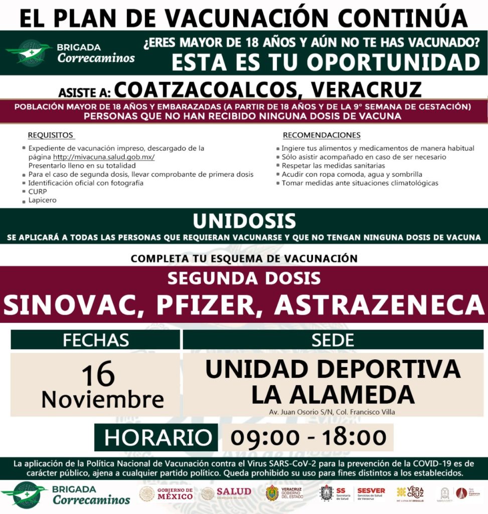 Este 16 de noviembre en #Coatzacoalcos se estará aplicando la vacuna a rezagados, CONOCE AQUÍ 👇 la sede y el horario de aplicación.