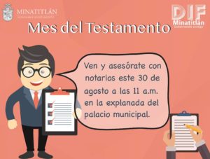 Con el objetivo de trabajar para la población que más lo necesita, el DIF Municipal de Minatitlán que preside la Lic. Elizabeth Reyes Toledo en coordinación con el H. Ayuntamiento de Minatitlán invita a la ciudadanía en general a las asesorías jurídicas en materia testamentaria en conmemoración del mes del testamento.