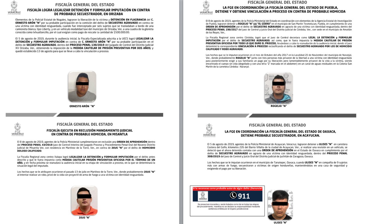 En coordinación con autoridades del estado de Oaxaca, fue detenido en Acayucan el probable autor del delito de secuestro agravado identificado como Ulises “N”; en Coatzacoalcos, dentro del proceso penal 713/2019, fueron vinculados a proceso los probables secuestradores Juan “N”, Víctor Manuel “N” y Jesús Manuel “N”; en Isla la Policía ministerial detuvo a los probables secuestradores Bryan Eduardo “N”, Pedro “N” y Carla Daniela “N”, quienes en audiencia inicial fueron imputados por el Juez de Control.