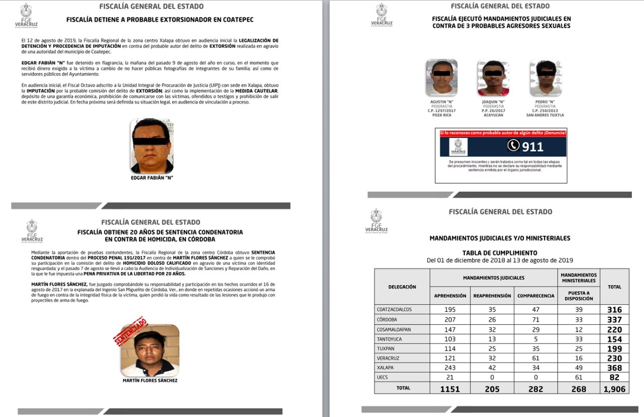 En este periodo fueron detenidos los probables pederastas Agustín “N”, en Poza Rica; Joaquín “N”, en Acayucan y Pedro “N”, en San Andrés Tuxtla; asimismo, se informó que del 1 de diciembre de 2018, al 13 de agosto del año en curso han sido cumplidos 1,906 mandamientos judiciales.