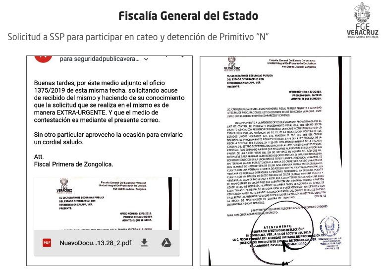 Asimismo, informó que en el hecho participaron cuatro personas, contra quienes fueron obtenidas órdenes de aprehensión, uno de los cuales identificado como Primitivo “N” se suicidó momentos antes de su detención; desmintió que se investigue una probable ejecución extrajudicial, toda vez que los hechos que derivaron en su deceso constan en el resultado de una necropsia; así como en entrevista realizada a su cónyuge, registrada en audio, video y por escrito y que se cuenta con el acuse de las solicitudes realizadas a la SSP por vía oficiosa y mediante correos electrónicos, para ejecutar una orden de cateo obsequiada por un juez y realizar la detención.
