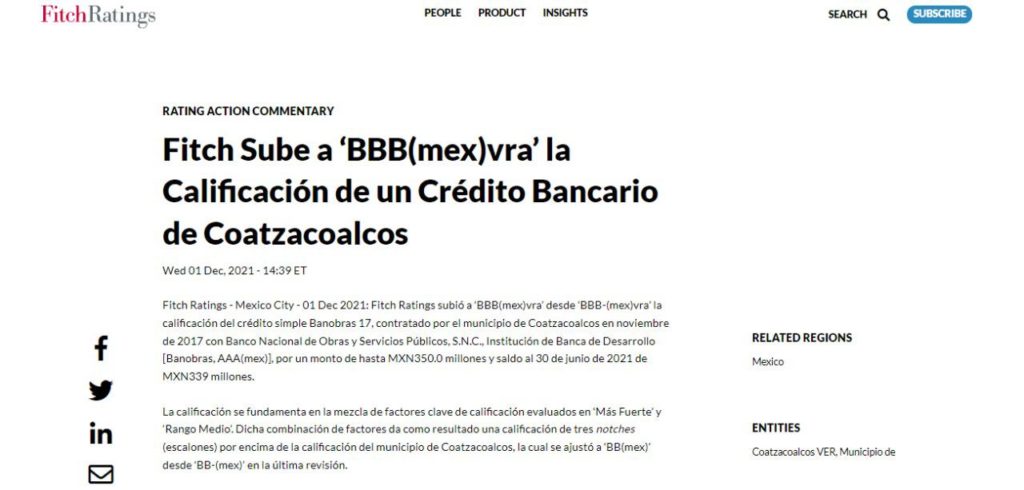 Desde su portal, esta que es una de las instituciones de mayor prestigio en el mundo occidental, explica que la calificación de Coatzacoalcos -en referencia al ayuntamiento- se ajustó a ‘BBB(mex)’ desde ‘BBB-(mex)’ en la última revisión.