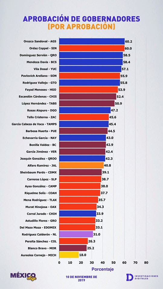 La encuesta que analiza y mide la popularidad de los 32 gobernadores del país, ubica al gobernador de Aguascalientes en perimera posición con 60.2%, seguido de Sinaloa con 60%.