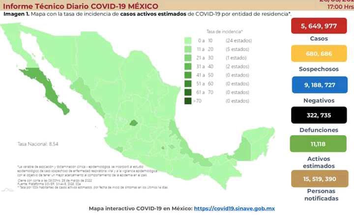 La Secretaría de Salud informó este sábado que México suma un total de 5 millones 649 mil 977 casos positivos confirmados acumulados y 322 mil 735 muertes por COVID-19.
