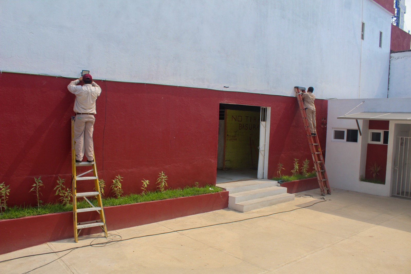 Nanchital, Ver. – En el remodelado y rehabilitado Mercado Antonio J. Bermúdez, empleados del Departamento de Alumbrado Público, pertenecientes al Ayuntamiento de Nanchital, llevaron a cabo este miércoles la instalación de 4 reflectores afuera de los nuevos sanitarios.
