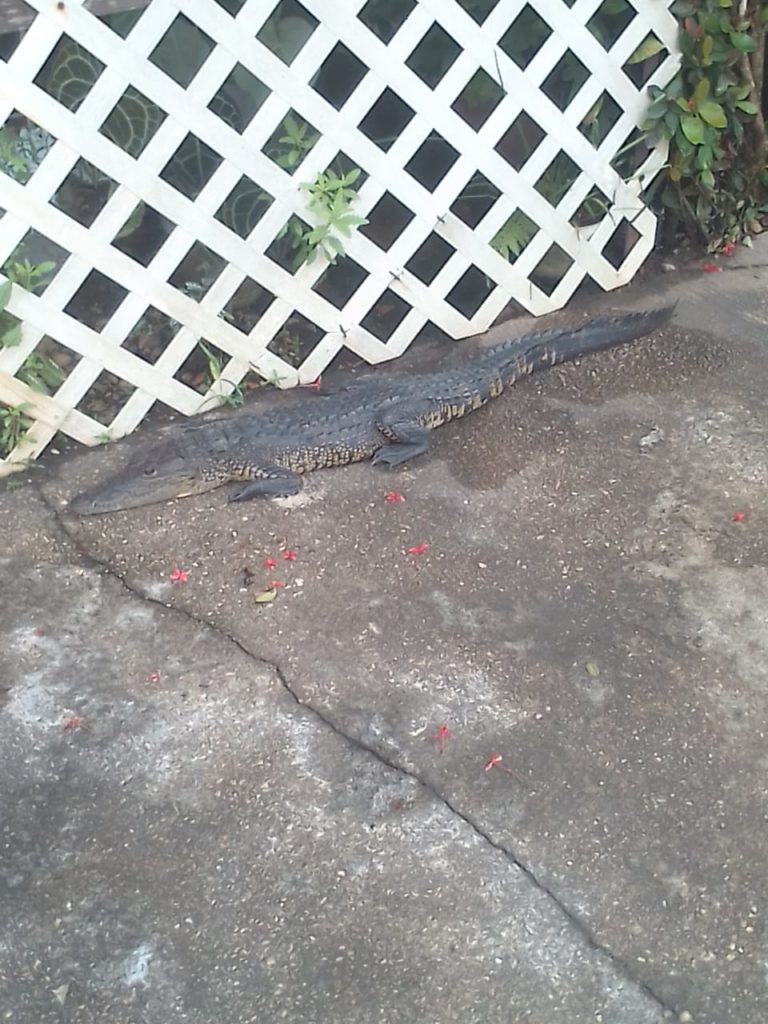 Vecinos de la calle gladiola del fraccionamiento jardines del bosque de Cosoleacaque despertaron con una visita poco habitual a su domicilio, un cocodrilo de buen tamaño reposaba tranquilo en el patio de su hogar.