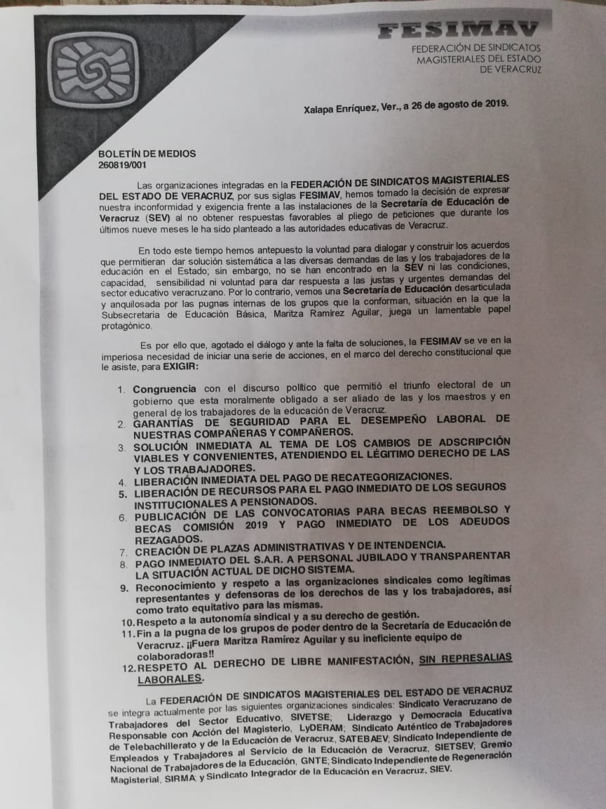 Los inconformes que aseguran son más de 7 mil en todo el estado, a través de un pliego petitorio exigen al Secretario de Educación en el Estado, que se cumplan con las pretensiones de la demanda en su escrito, en especial el pago de sus alcances devengados desde hace 9 meses.