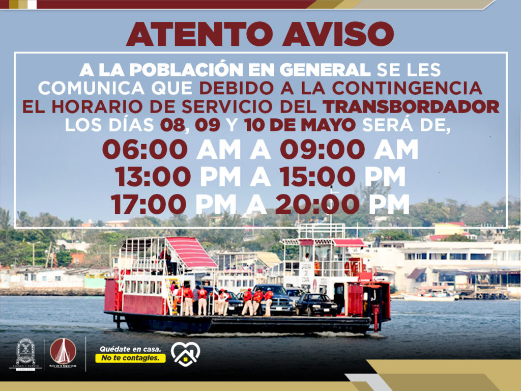 Este viernes y hasta el domingo 10 de Mayo habrá tres horarios de servicios, de 6:00 am a 9:00 am, después de estas horas el ferry tomará un receso y volverá a funcionar de 1 de la tarde (13:00 horas) hasta las 3 de la tarde (15:00 horas).