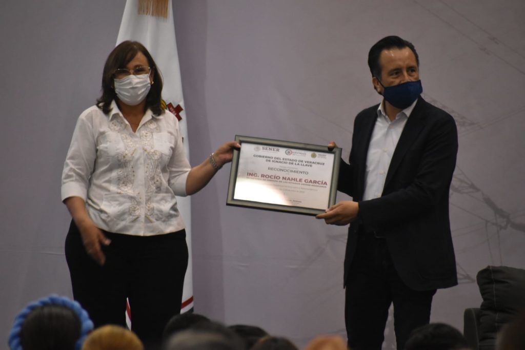 Finalmente, el Gobernador hizo entrega de un merecido reconocimiento a Secretaria de Energía, Rocío Nahle García, por la exitosa Conferencia Magistral.