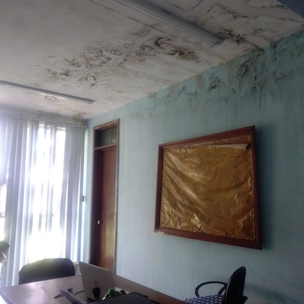 Filtraciones de agua en el techo, puertas caídas y completamente deteriorado se encuentra el edificio de la planta de tratamiento de aguas residuales.