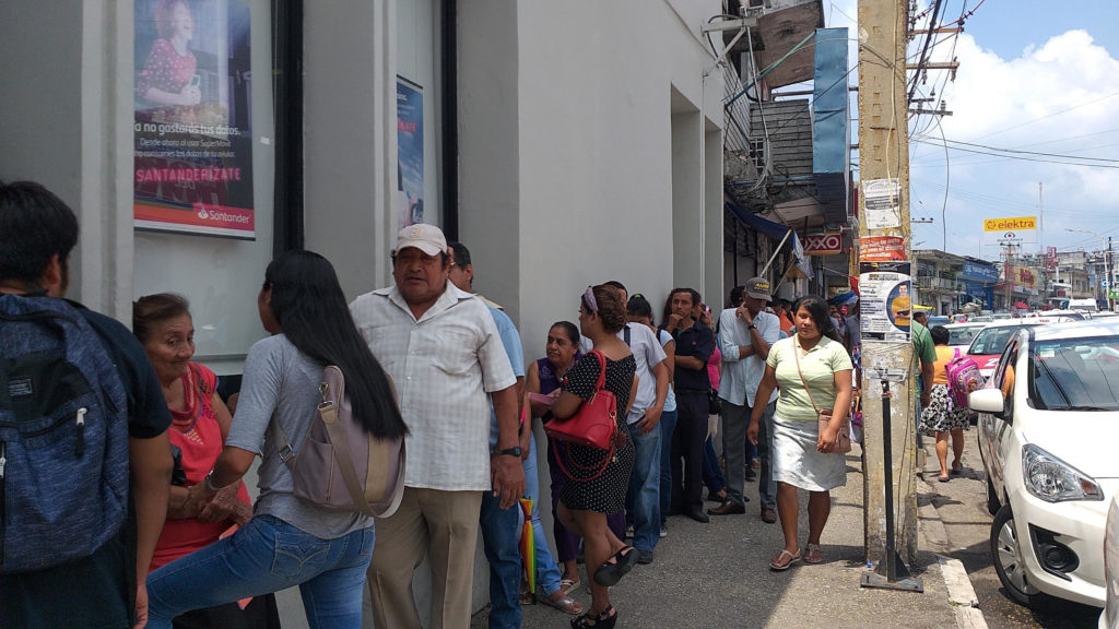 Mientras que el acceso se percibía aglomerado porque estaban las filas para cajeros automáticos y la fila de acceso al banco; aunado al primer filtro de Santander ubicado sobre la calle Hidalgo en el Centro de Minatitlán.