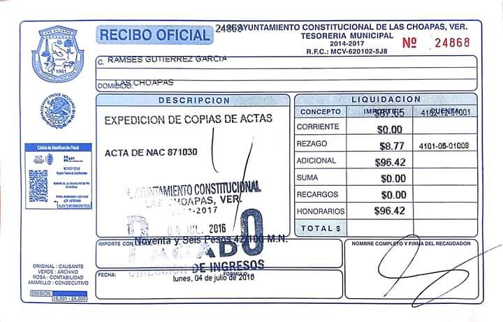 En el municipio de Las Choapas, Veracruz donde “gobierna” el alcalde Miguel A. Tronco Gómez desde la llegada de su administración, el departamento de tesorería municipal al hacer pagos los contribuyentes de derechos este departamento les da recibos que son copias simples en blanco y negro y con un folio dudoso así como un QR borroso imposible de leer por algún lector electrónico, tal como se muestra en las fotografías anexas, recibos pagados y obtenidos por mí al acudir a hacer pagos de derechos de servicios del registro civil (copias de acta de nacimientos).