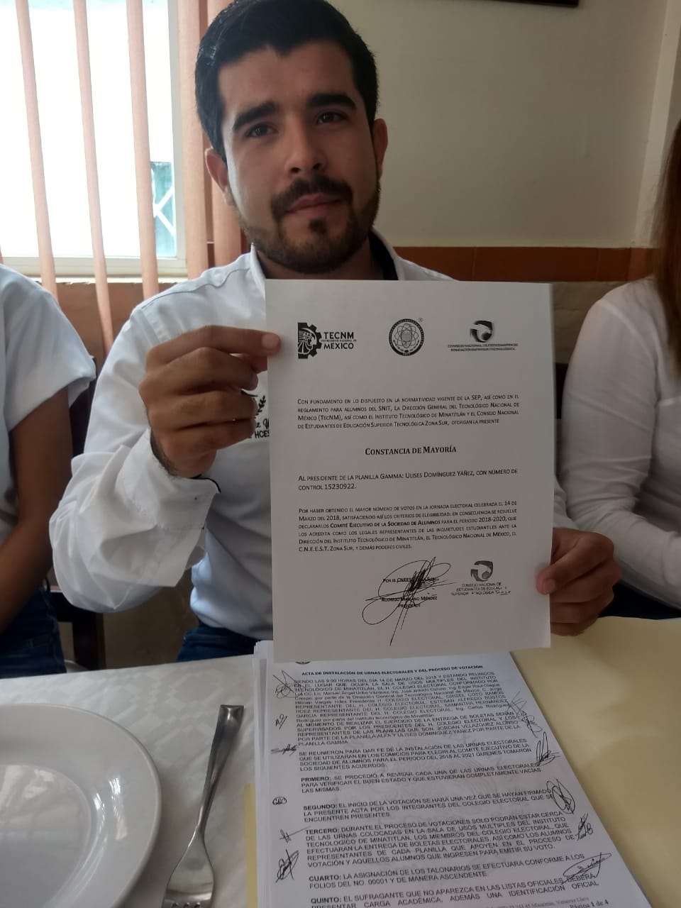Con documento en mano, exhibió su constancia de mayoría donde gana con 1601 votos, sobre su oponente de la planilla Alfa con 1586, pidiendo que haya el respeto a los resultados y se evite crear confrontaciones entre el alumnado, ya que su comité está en el servicio para todos los alumnos.