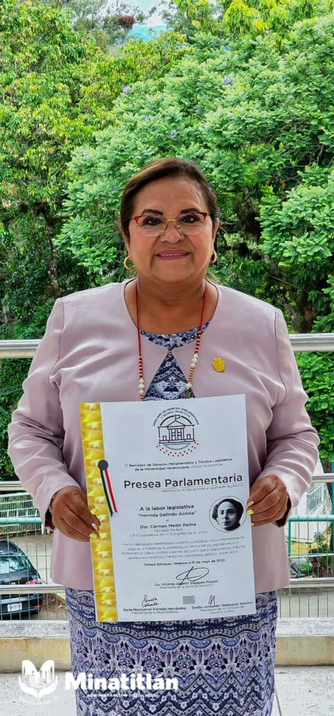 Xalapa Ver. – La presidenta municipal Carmen Medel Palma fue galardonada con la Presea Parlamentaria a la Labor Legislativa “Hermila Galindo Acosta”, como un reconocimiento su labor durante su gestión como Diputada Federal por Minatitlán.