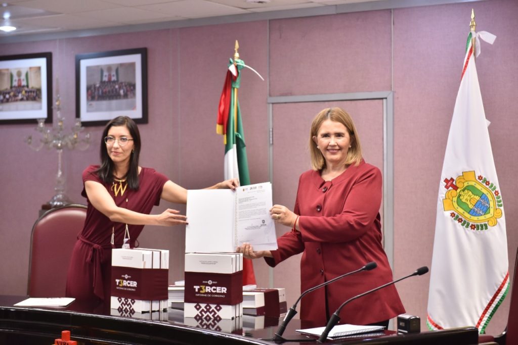 En cumplimiento a lo dispuesto en la fracción XXI del artículo 49 de la Constitución Política del Estado de Veracruz de Ignacio de la Llave, la presidenta de la Mesa Directiva de este Poder, diputada Cecilia Josefina Guevara Guembe, recibió, de la jefa de la Oficina de Programa de Gobierno, Waltraud Martínez Olvera, el Tercer Informe de Gobierno del ingeniero Cuitláhuac García Jiménez, gobernador constitucional del estado.