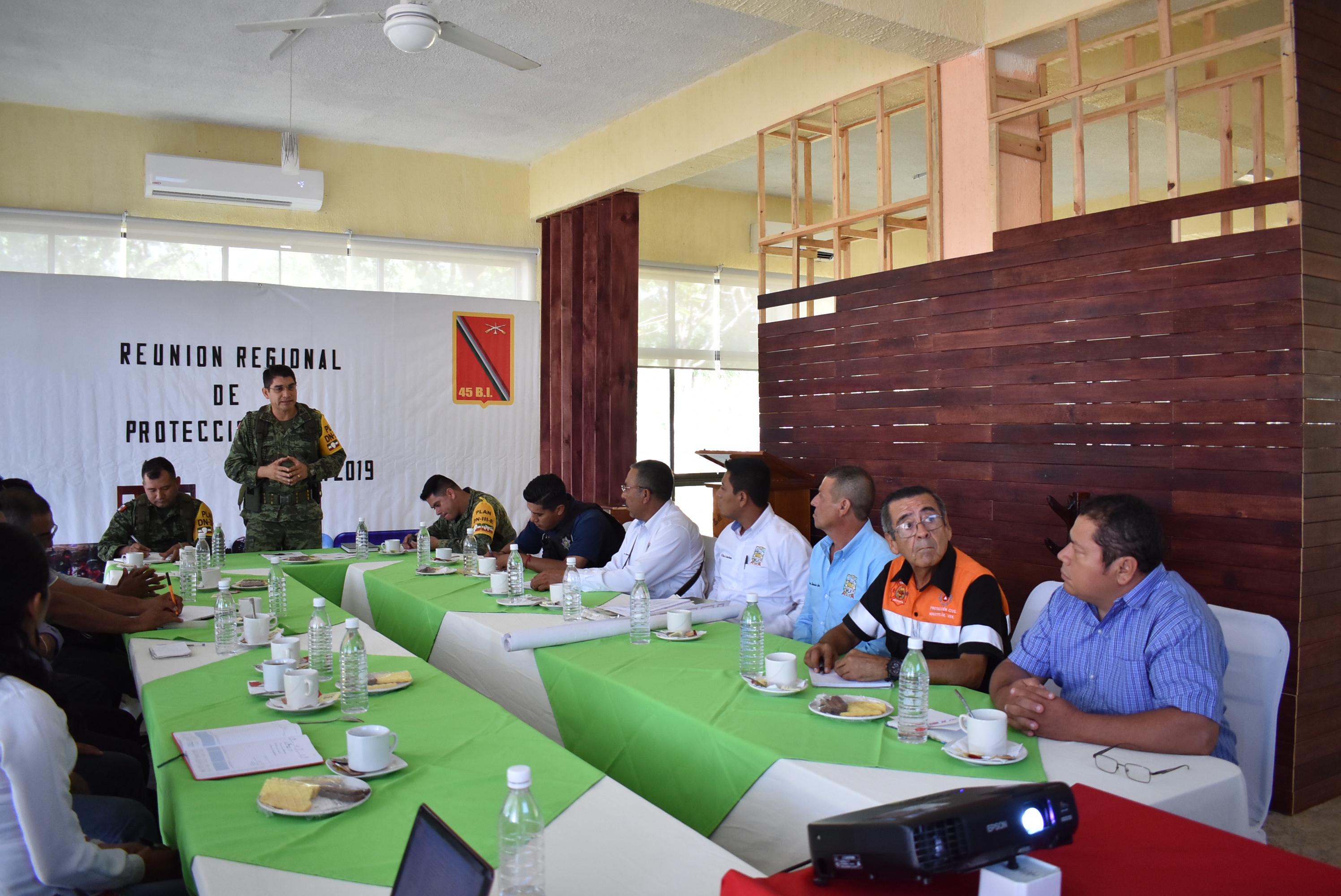 Durante la reunión realizada en las instalaciones del 45 Batallón de Infantería el Coronel de Infantería, Netzahualcóyotl Albarrán Mendoza señaló que el Ejército Mexicano se encuentra preparado para hacer frente a la época de lluvias en la zona sur y se estarán realizando trabajos permanentes de capacitación y supervisión de las áreas como parte de las acciones que comprende el Plan DN III que contempla la fase preventiva, de auxilio y recuperación.